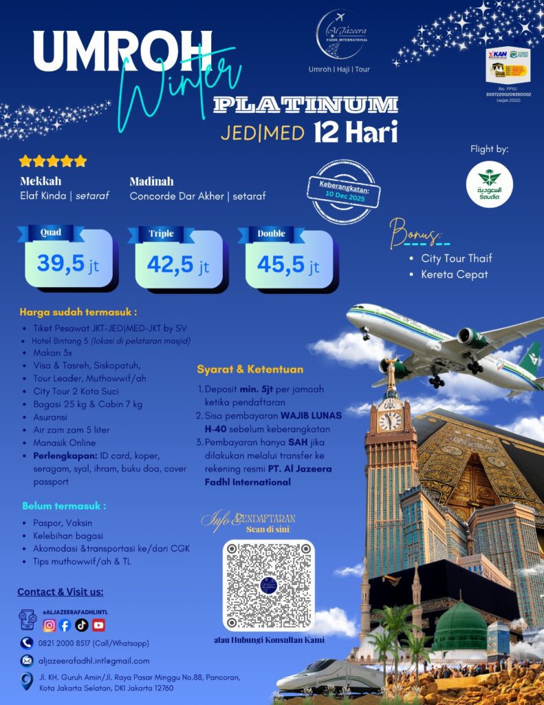 Ya. Al Jazeera Fadhl International telah terdaftar dan memiliki izin resmi dari Kementerian Agama Republik Indonesia, memastikan setiap perjalanan umrah dan haji sesuai aturan yang berlaku.